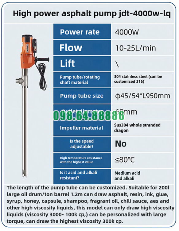 Khác với các dòng bơm dùng cho chất loãng, Bơm điện hút chất đặc từ thùng phuy JDT-4000W-LQ phải xử lý môi chất có độ nhớt lớn, lực cản cao. Trong điều kiện đó, trục quay Inox 304 phát huy ưu điểm nhờ độ chắc chắn và khả năng làm việc ổn định dưới tải nặng, giúp máy vận hành bền bỉ hơn.