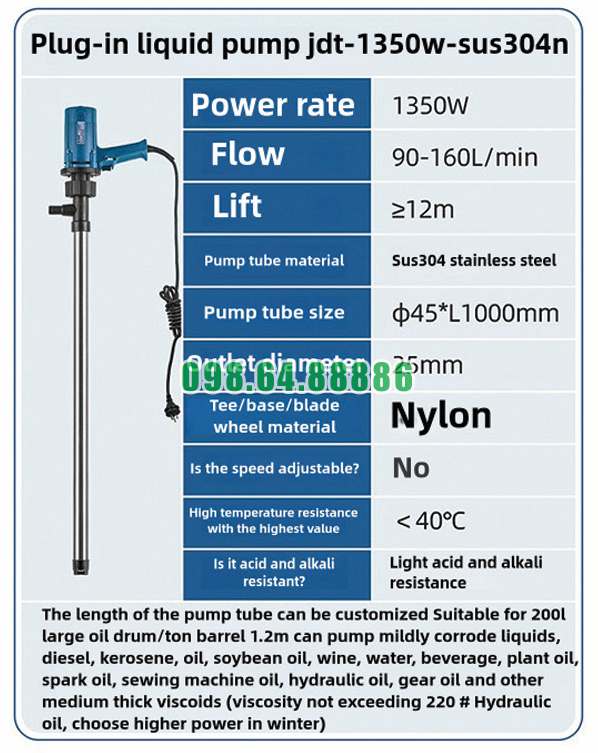 Máy bơm công nghiệp cắm điện cho dầu nhớt JDT-1350W-SUS304N