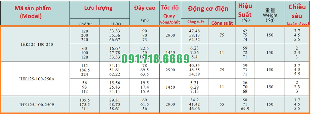 Bảng lưu lượng của bơm nước cánh hở công nghiệp model IHK125-100-250
