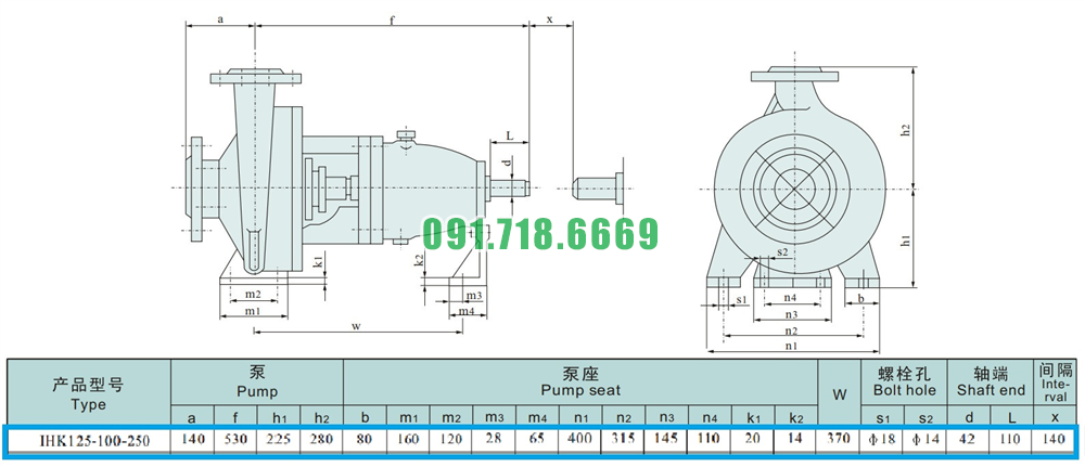 Kích thước của đầu bơm nước cánh hở công nghiệp model IHK125-100-250