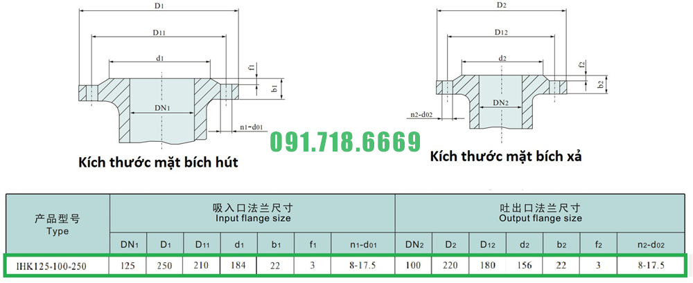 Kích thước mặt bích của bơm nước cánh hở công nghiệp model IHK125-100-250