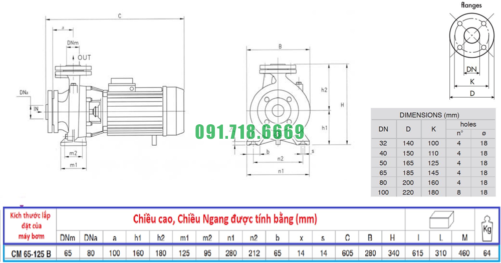 Kích thước máy bơm nước li tâm CM65-125B đường thoát đầu vào ra Dn65