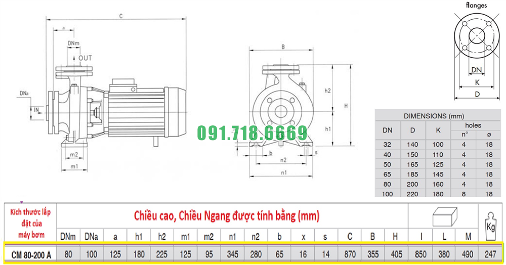 Kích thước máy bơm nước li tâm CM80-200A đường thoát đầu vào ra Dn100