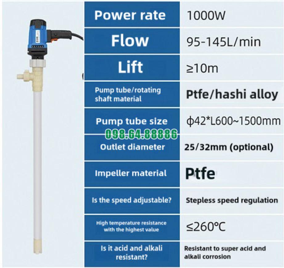 Bơm điện nhúng thùng phuy bơm hóa chất cao cấp model JDT-1000W-PTFE