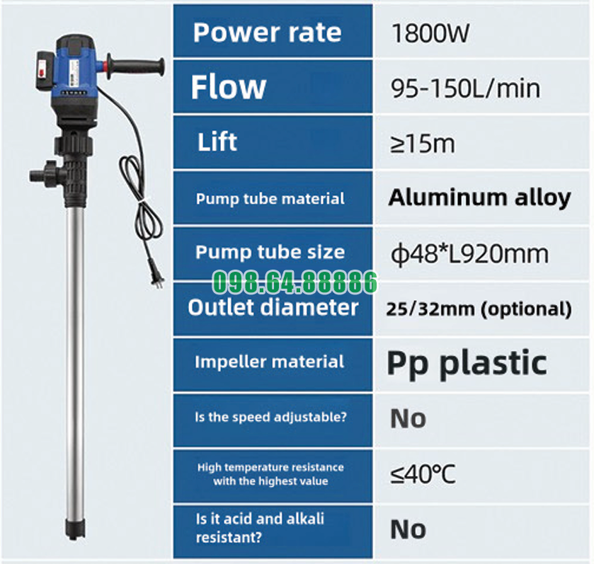 Sự vượt trội về lưu lượng chất lỏng của bơm điện thùng phuy cao cấp JDT-1800W-L92