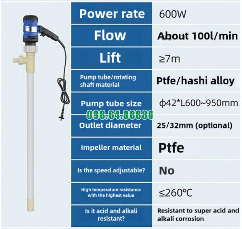 Bơm drum hóa chất nồng độ cao, lưu lượng lớn 100 lít/phút model JDT-600W