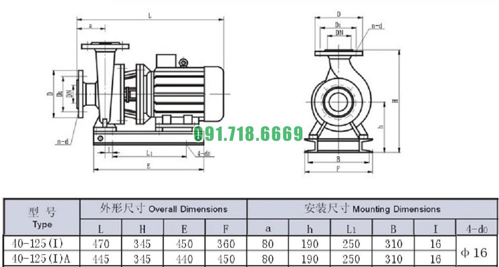 Bản vẽ cấu tạo và kích thước bơm li tâm trục ngang mã SLW-ISW40-125-I lưu lượng 16.3 m3/h