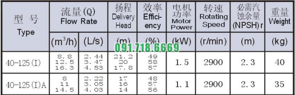 Bảng thông số kỹ thuật bơm li tâm trục ngang mã SLW-ISW40-125-I lưu lượng 16.3 m3/h