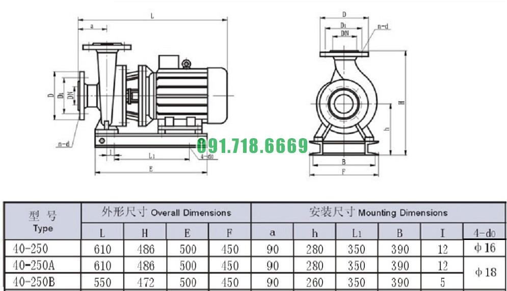 Bản vẽ cấu tạo và kích thước bơm li tâm trục ngang mã SLW-ISW40-250 lưu lượng 8.3 m3/h