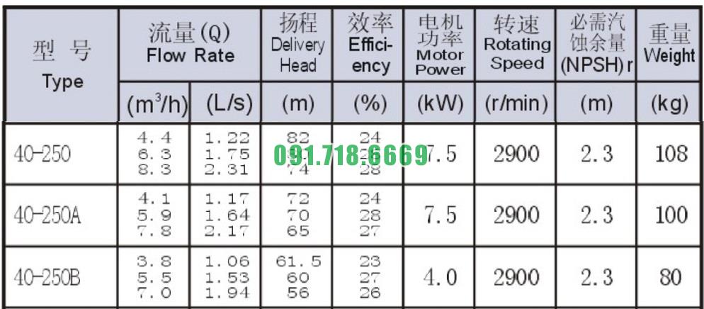 Bảng thông số kỹ thuật bơm li tâm trục ngang mã SLW-ISW40-250 lưu lượng 8.3 m3/h