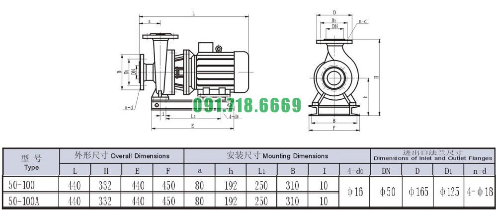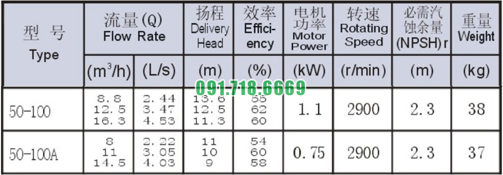 Bảng thông số kỹ thuật bơm li tâm trục ngang mã SLW-ISW50-100 lưu lượng 16.3 m3/h
