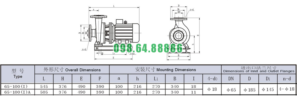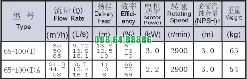 Bảng thông số kỹ thuật bơm li tâm trục ngang model SLW65-ISW65-100-I công suất 18.1 L/s