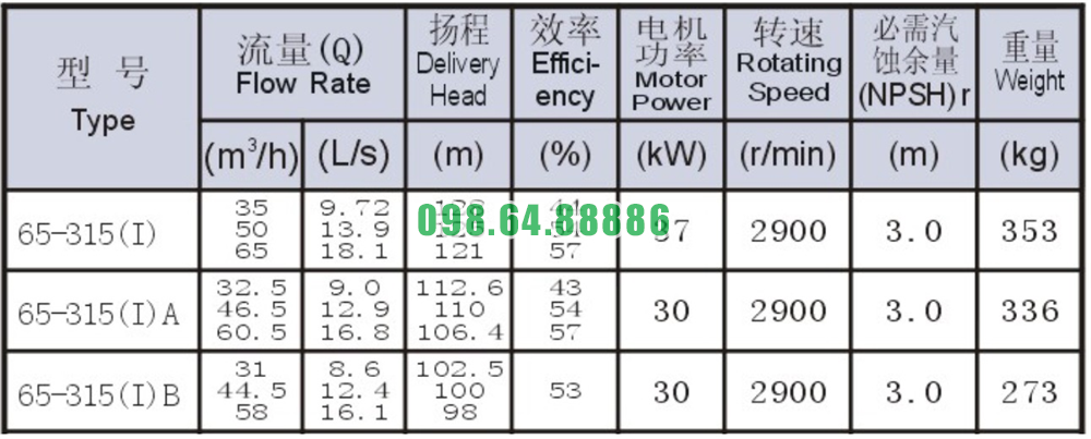 Bảng thông số kỹ thuật bơm li tâm trục ngang model SLW65-ISW65-315-I công suất 18.1 L/s