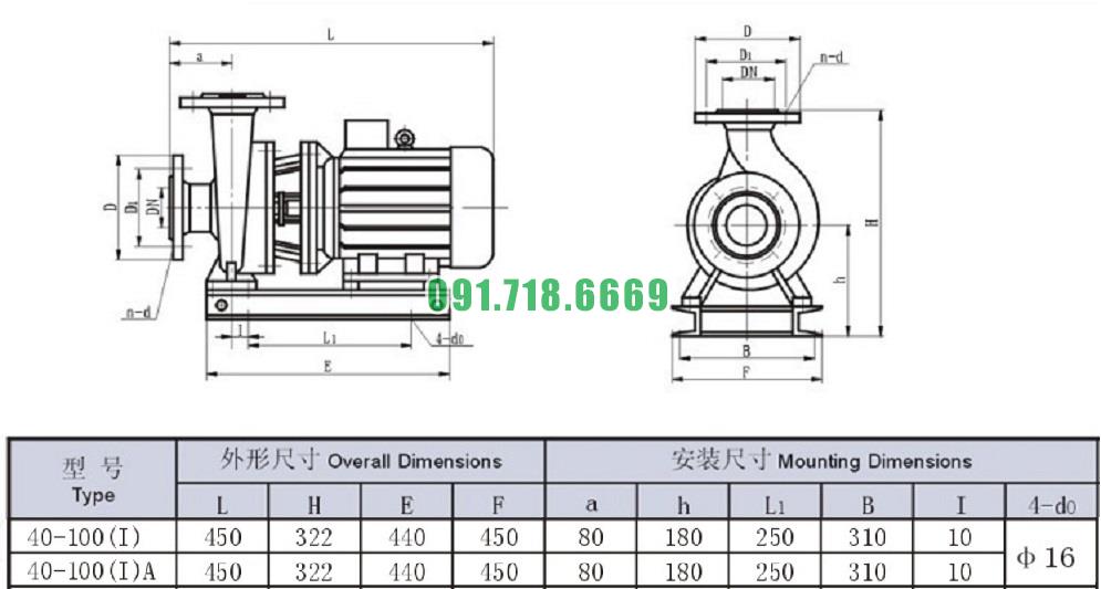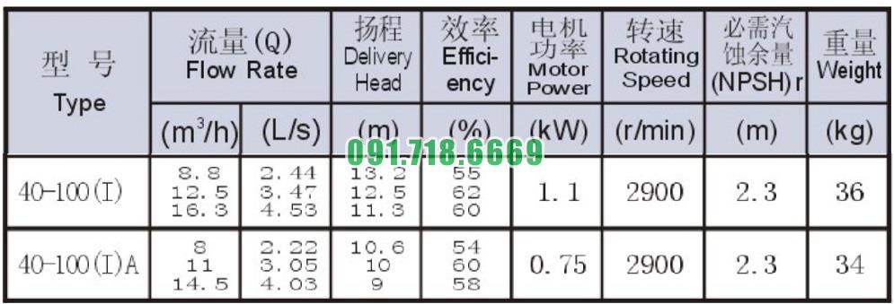 Bơm li tâm trục ngang SLW-ISW40-100-I công suất 1.1 kw lưu lượng 16.3 m3/h