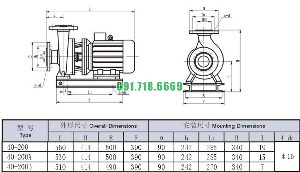 Bản vẽ cấu tạo và kích thước bơm li tâm trục ngang SLW-ISW40-200-I có động cơ 5.5 kw đẩy cao 51.2m