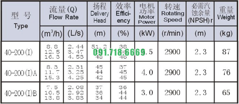 Bảng thông số kỹ thuật bơm li tâm trục ngang SLW-ISW40-200-I có động cơ 5.5 kw đẩy cao 51.2m