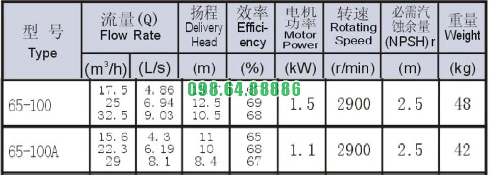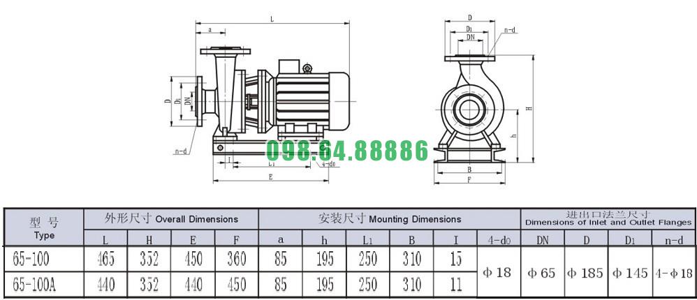 Bảng thông số kỹ thuật bơm li tâm trục ngang SLW-ISW65-100