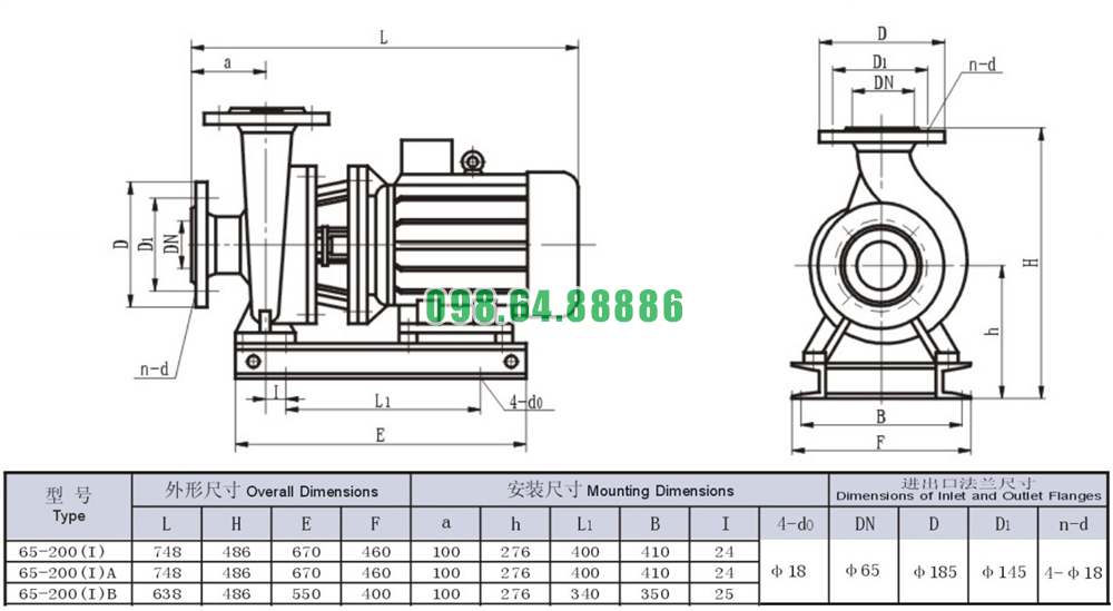 Bản vẽ cấu tạo và kích thước bơm li tâm trục ngang SLW65-ISW65-200-I có động cơ 15 kw đẩy cao 53.5m