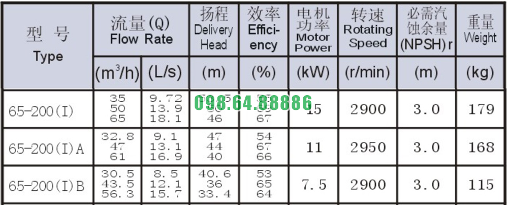 Bảng thông số kỹ thuật bơm li tâm trục ngang SLW65-ISW65-200-I có động cơ 15 kw đẩy cao 53.5m