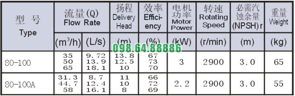 Bảng thông số kỹ thuật bơm li tâm trục ngang SLW80-ISW80-100 có động cơ 3 kw đẩy cao 13.8m