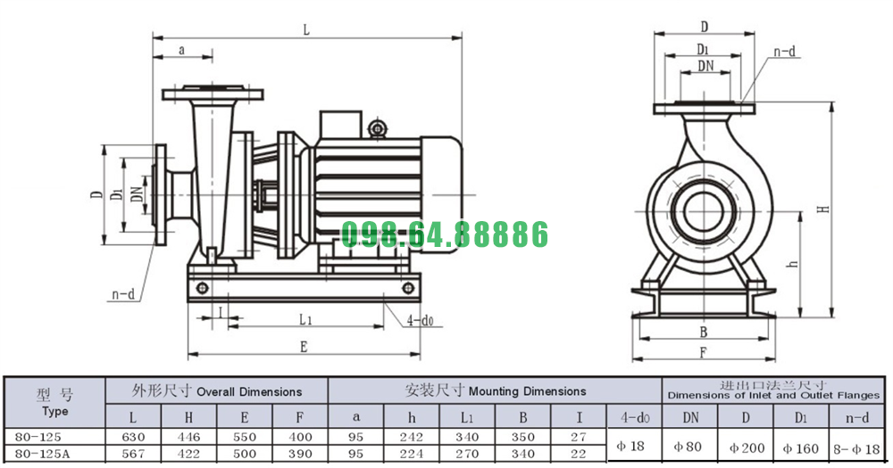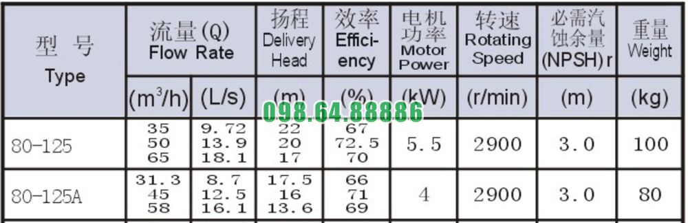 Bảng thông số kỹ thuật bơm li tâm trục ngang SLW80-ISW80-125