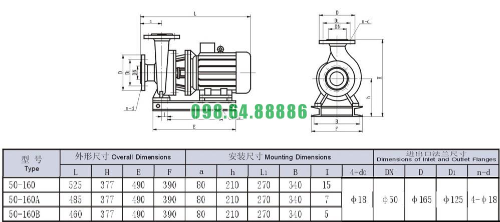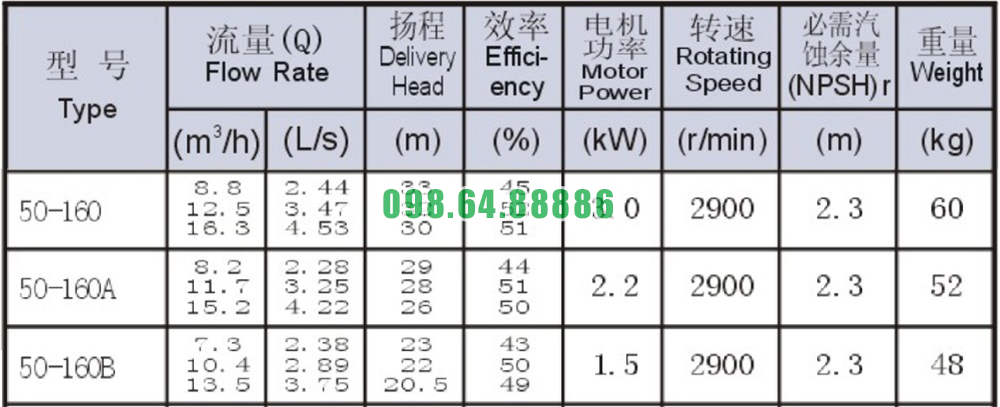 Bảng thông số kỹ thuật bơm nước li tâm trục ngang SLW-ISW50-160