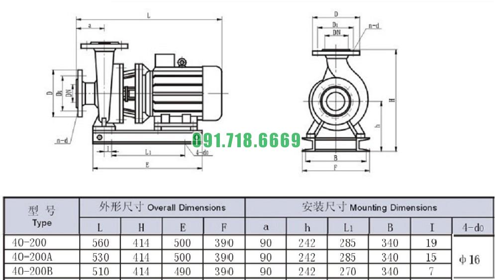 Bản vẽ cấu tạo và kích thước bơm nước nằm ngang SLW-ISW40-200 công suất 2.2 kw
