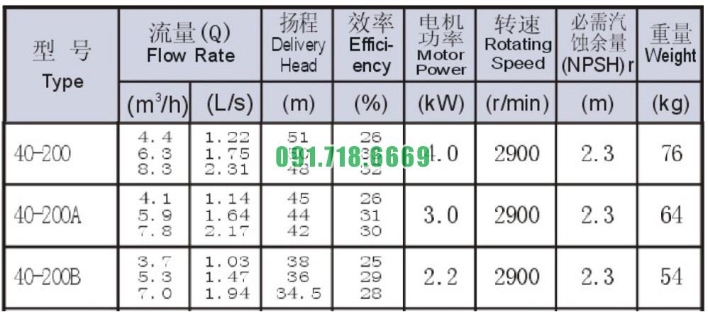 Bảng thông số kỹ thuật bơm nước nằm ngang SLW-ISW40-200 công suất 2.2 kw