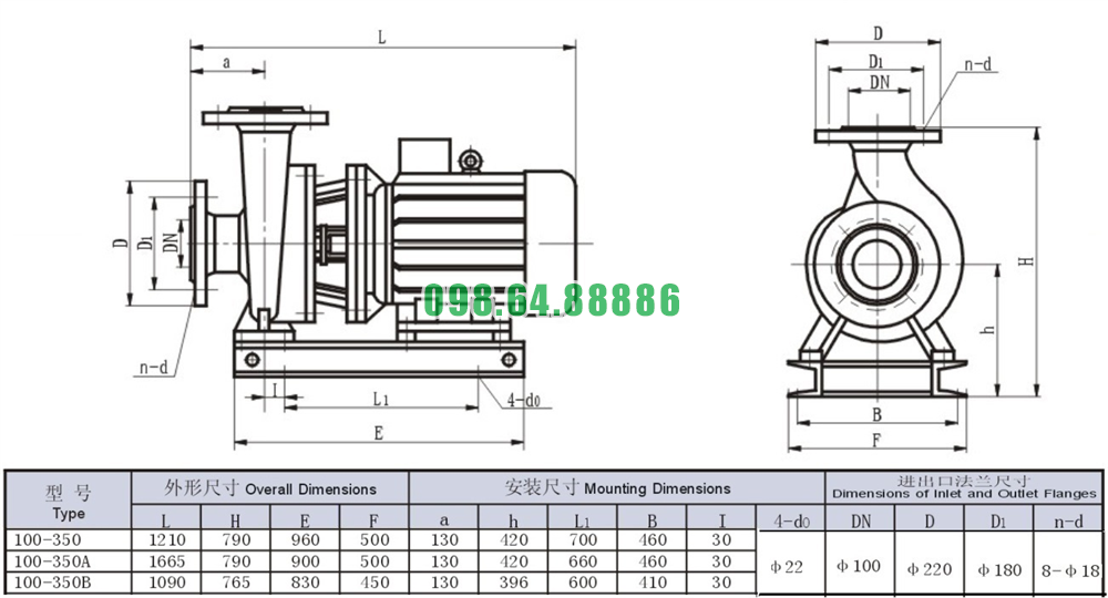 Bản vẽ cấu tạo và kích thước bơm nước nằm ngang SLW100-ISW100-350 vòng quay 2900 r/min