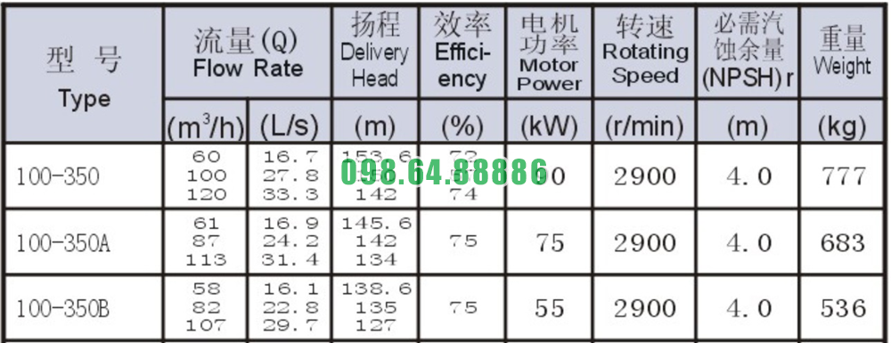 Bảng thông số kỹ thuật bơm nước nằm ngang SLW100-ISW100-350 vòng quay 2900 r/min