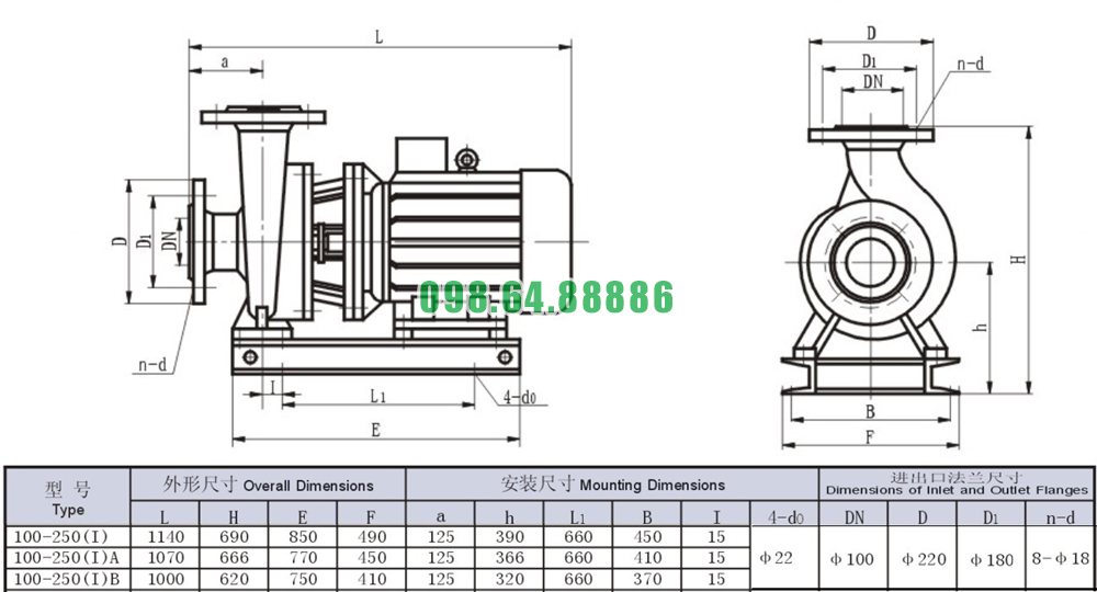 Bản vẽ cấu tạo và kích thước bơm nước nằm ngang SLW100-ISW100-250-I độ hút sâu 4.0m