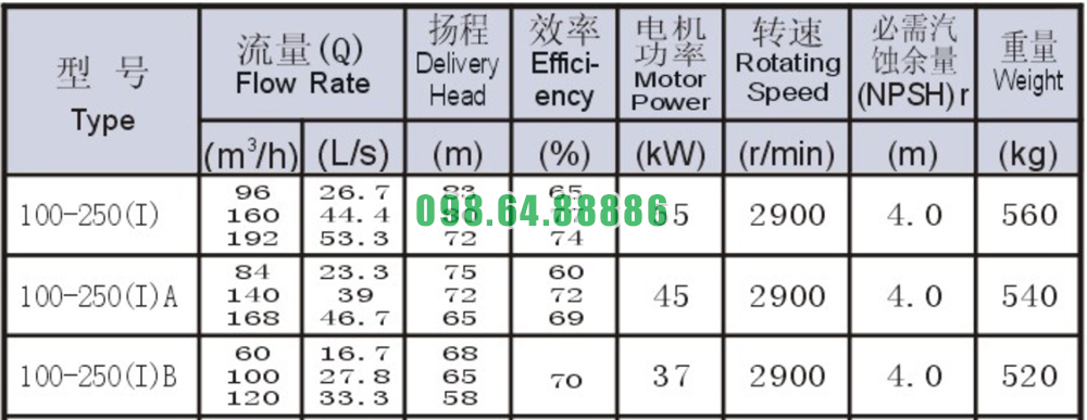 Bảng thông số kỹ thuật bơm nước nằm ngang SLW100-ISW100-250-I độ hút sâu 4.0m