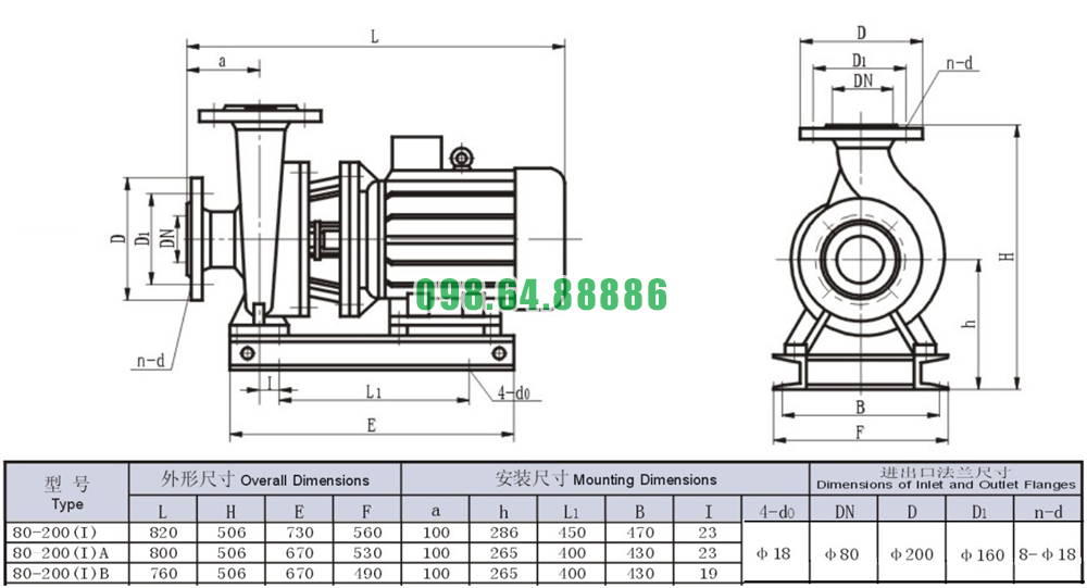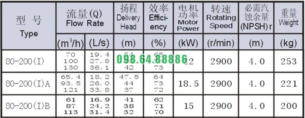 Bảng thông số kỹ thuật bơm nước nằm ngang SLW80-ISW80-200-I công suất 22 kw