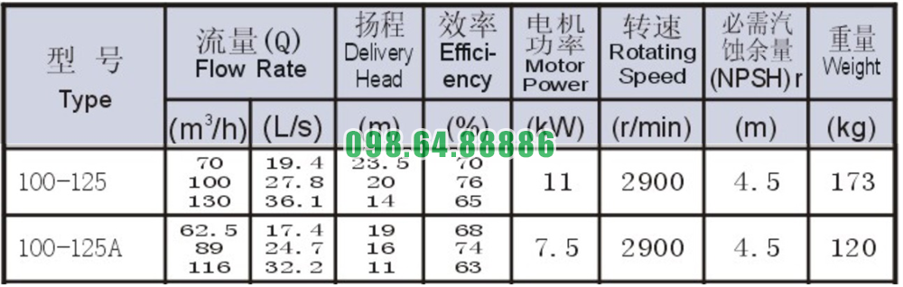Bảng thông số kỹ thuật bơm nước trục ngang SLW100-ISW100-125 đẩy cao max 23.5m