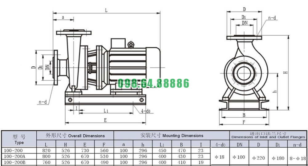 Bản vẽ cấu tạo và kích thước bơm nước trục ngang SLW100-ISW100-200 đẩy cao max 54m