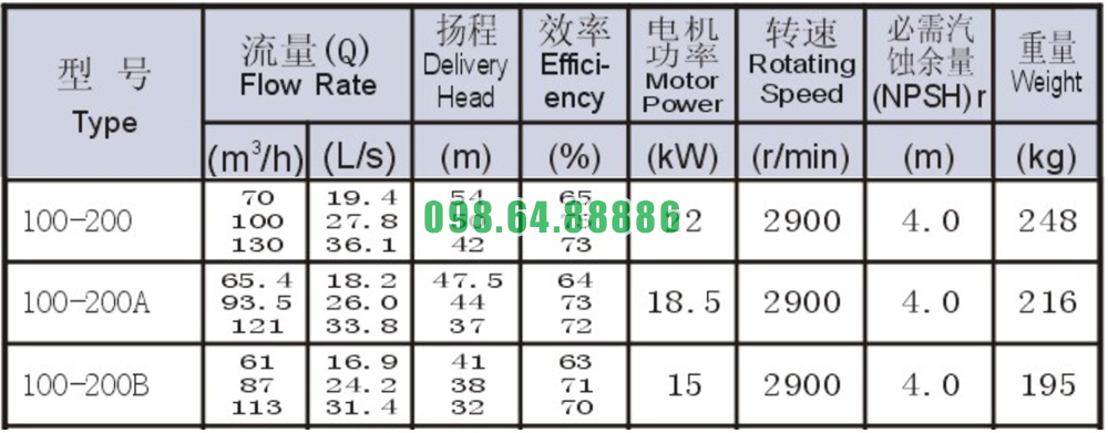 Bảng thông số kỹ thuật bơm nước trục ngang SLW100-ISW100-200 đẩy cao max 54m