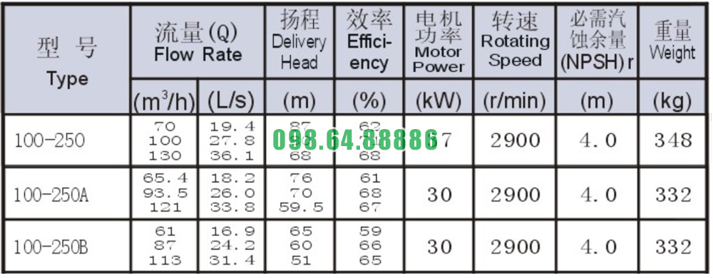 Bảng thông số kỹ thuật bơm nước trục ngang SLW100-ISW100-250 hút sâu 4.0m