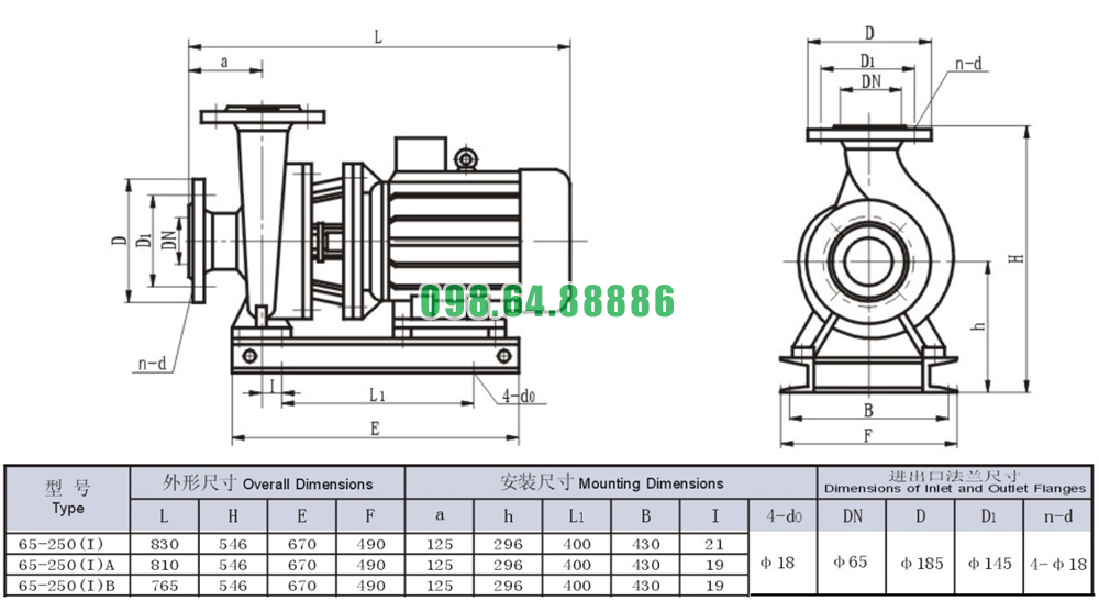 Bản vẽ cấu tạo và kích thước bơm nước trục ngang SLW65-ISW65-250-I khối lượng 238 kg