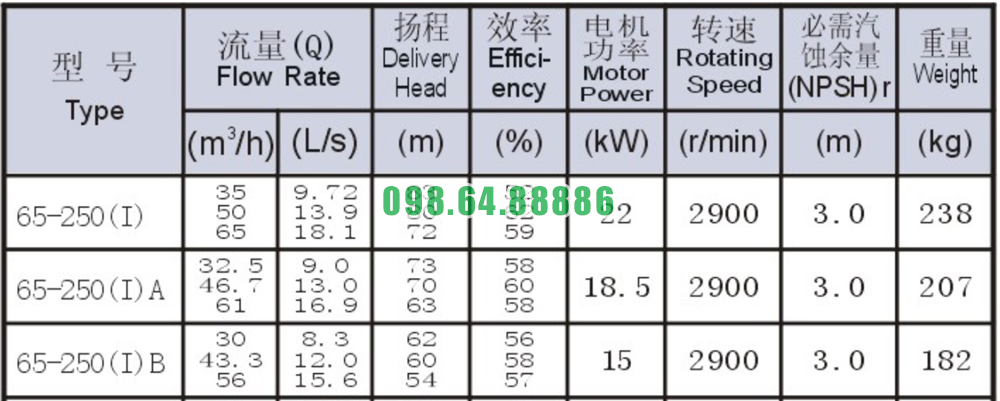 Bảng thông số kỹ thuật bơm nước trục ngang SLW65-ISW65-250-I khối lượng 238 kg
