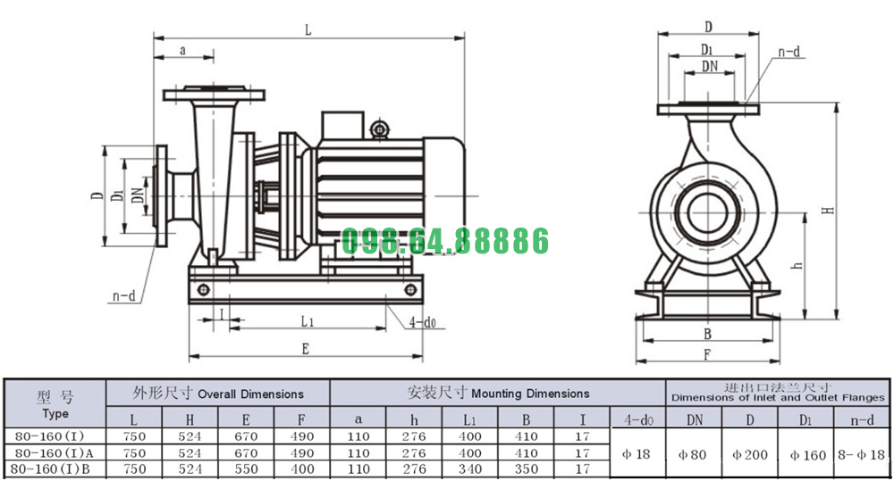 Bản vẽ cấu tạo và kích thước bơm nước trục ngang SLW80-ISW80-160-I hút sâu 4.5m