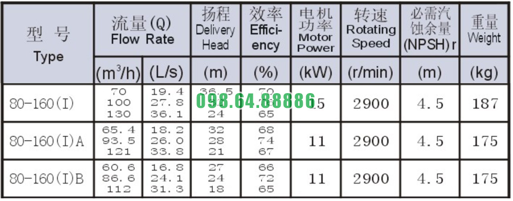 Bảng thông số kỹ thuật bơm nước trục ngang SLW80-ISW80-160-I hút sâu 4.5m