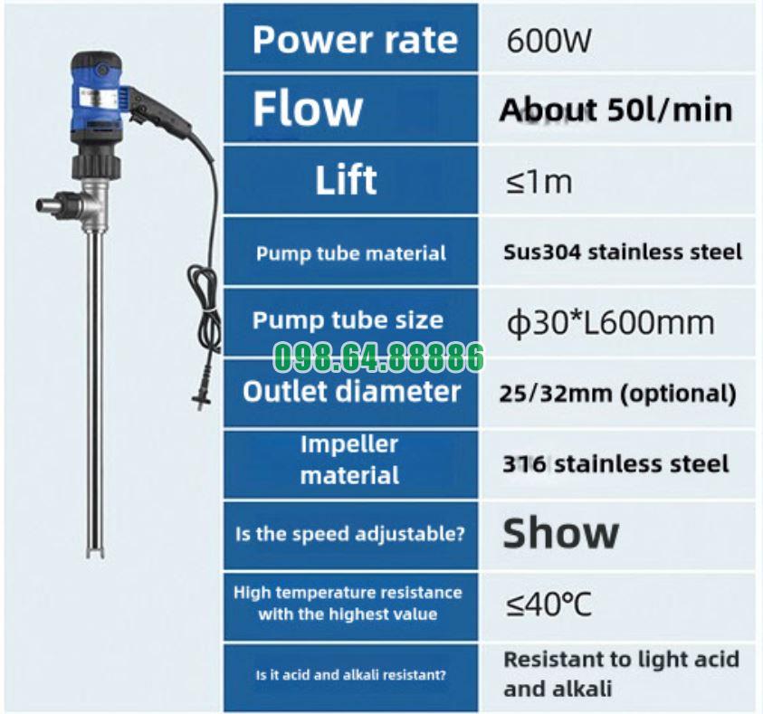 Bơm thùng phuy ống inox SUS304 JDT-600W được đánh giá là một trong những dòng bơm công nghiệp có độ bền cao nhất trong phân khúc nhờ cấu trúc cơ khí vững chắc và vật liệu chất lượng cao.