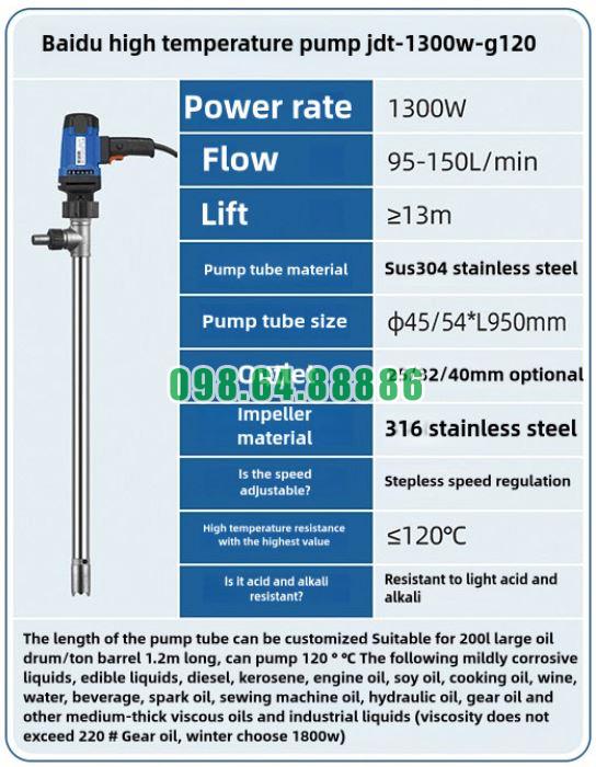 Bơm thùng phuy nhiệt độ cao JDT-1300W-G120 không cần bệ đỡ cố định hay đường ống lắp sẵn. Chỉ cần: