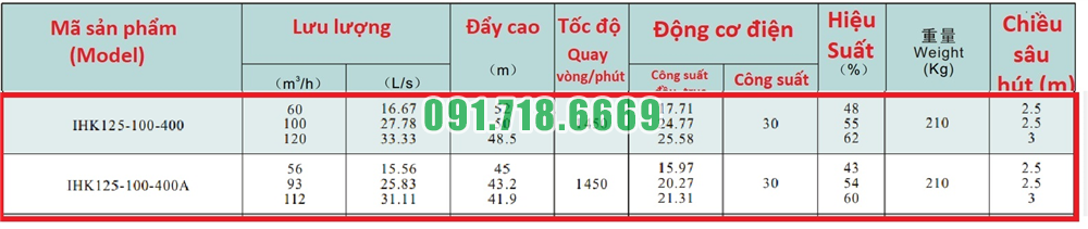 Bảng lưu lượng của máy bơm nước li tâm cánh hở IHK125-100-400 làm bằng inox