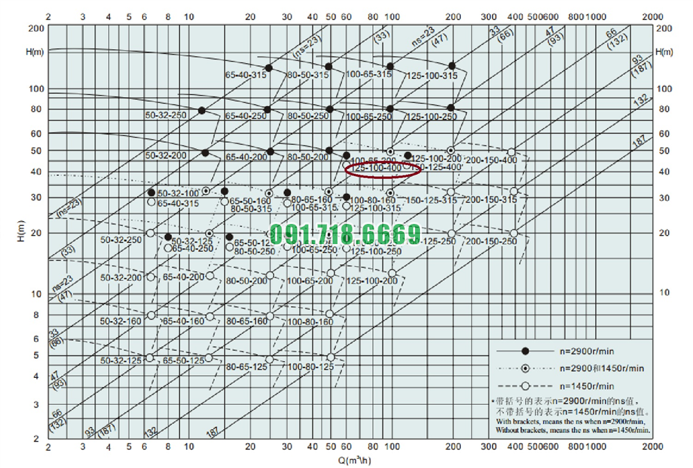 Đường cong hiệu suất của máy bơm nước li tâm cánh hở IHK125-100-400 làm bằng inox