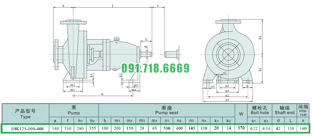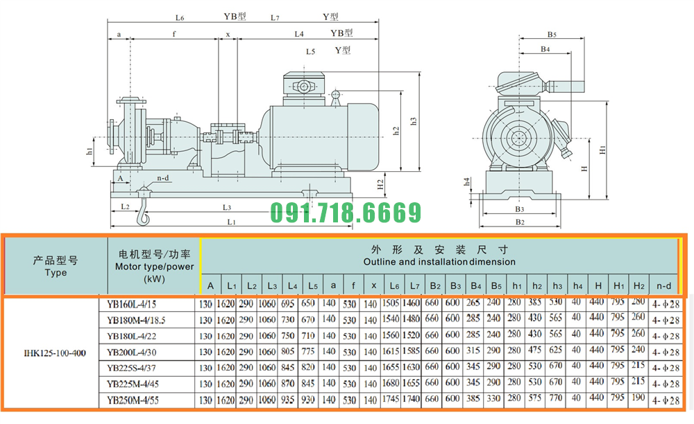 Kích thước lắp đặt của máy bơm nước li tâm cánh hở IHK125-100-400 làm bằng inox