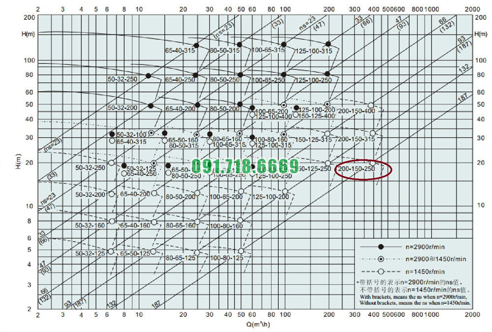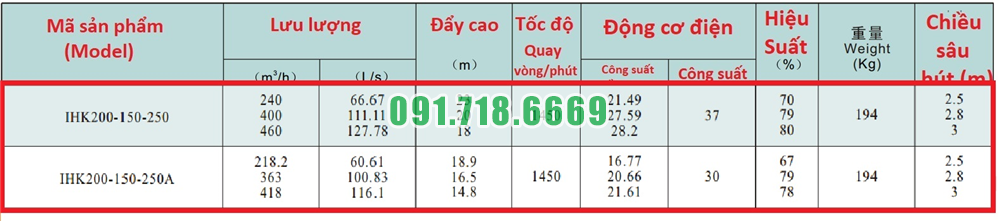 Bảng lưu lượng của máy bơm nước li tâm cánh hở IHK200-150-250 động cơ điện 37kw