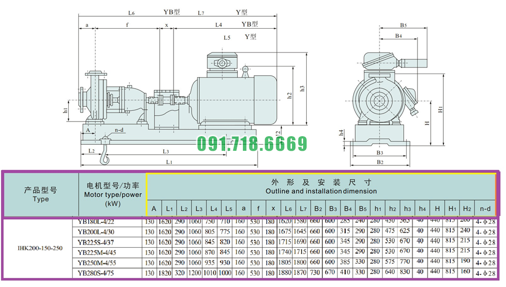 Kích thước của đầu máy bơm nước li tâm cánh hở IHK200-150-250 động cơ điện 37kw