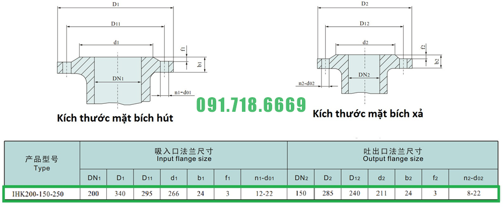 Kích thước mặt bích của máy bơm nước li tâm cánh hở IHK200-150-250 động cơ điện 37kw