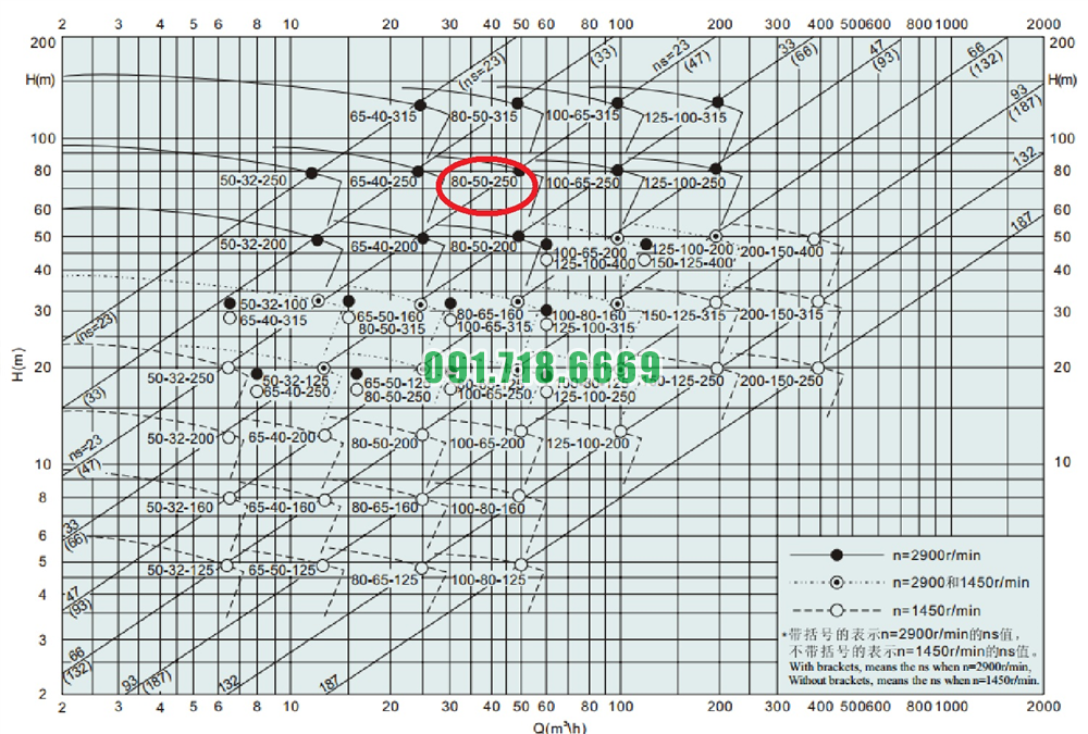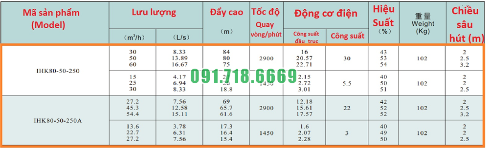 Bảng lưu lượng của máy bơm nước li tâm cánh hở IHK80-50-250 hiệu suất 13-60 m3/h